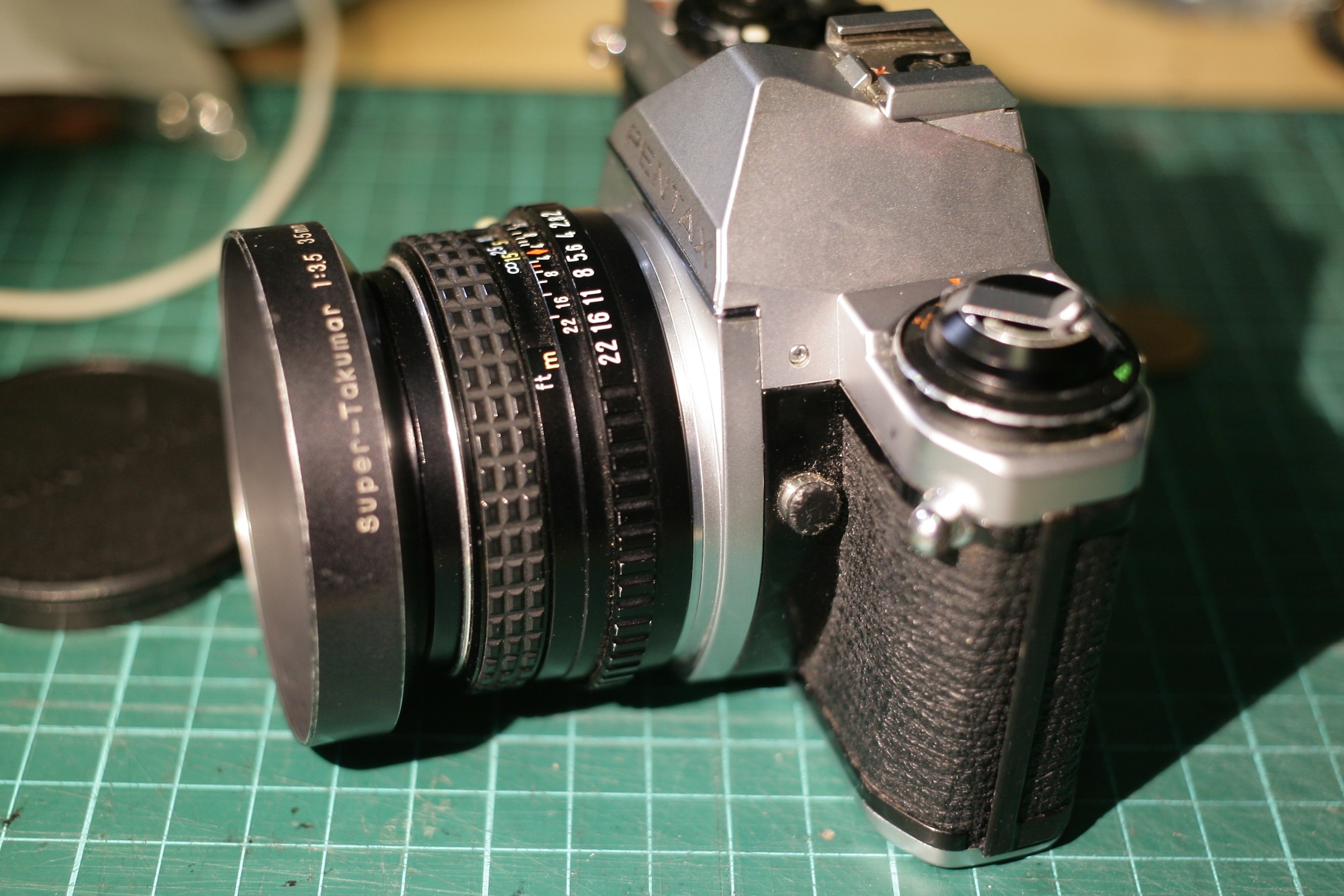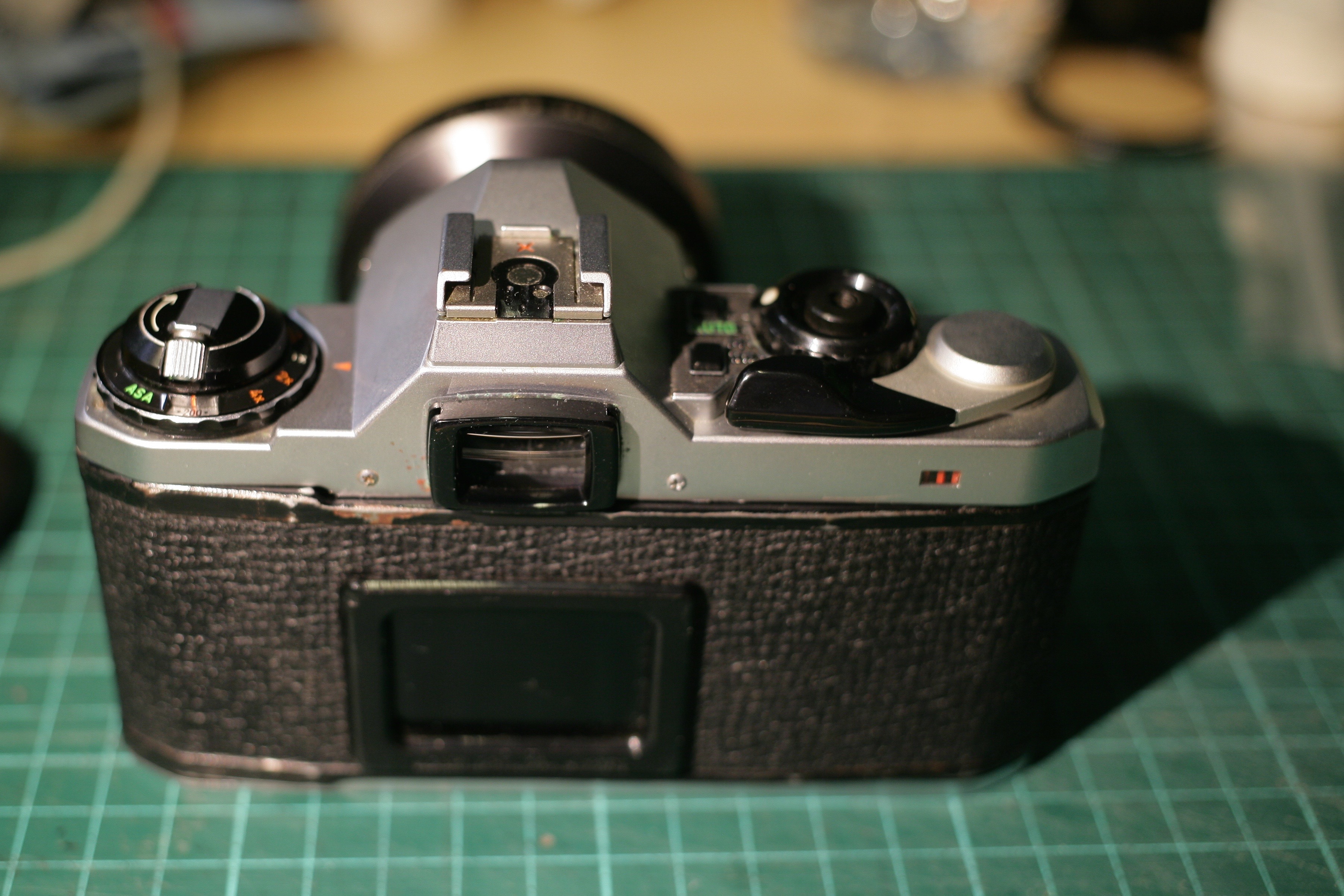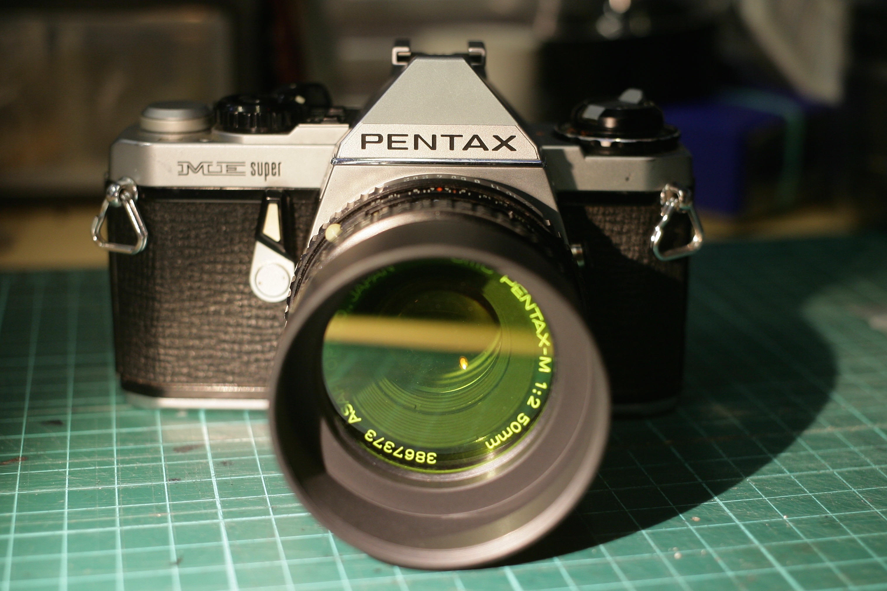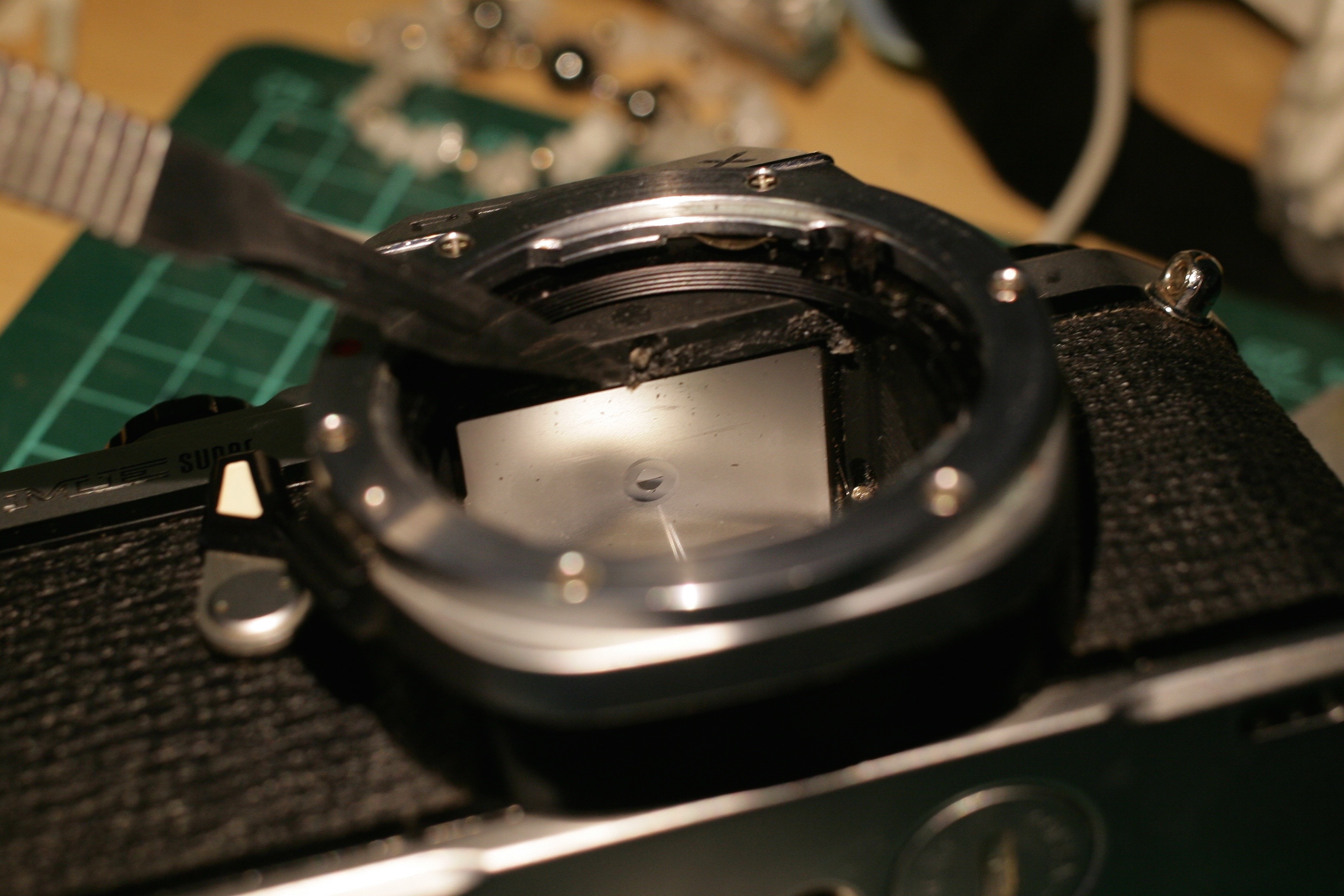 The lens could do with a B52 bomber with a tank full of agent orange. The fungus was just what I needed as it was my desire to show that even the worst of lenses can produce reasonable images. The ME Super came with the expected gummy light seals and an unexpected jammed inner meter coupling. Not to be deterred I put 4 minuscule drops of machine oil around the inner ring and waited over night. The oil had seeped into whatever corrosion had seized the coupling ring and the meter worked again. A cloth steeped in meths was then used as a capillary to mop up any oil. Not the correct way to fix the camera, but hey, this is a tough assignment. The lens was cleaned externally. Light seals replaced and the camera seemed to be alive again. One real bug is the focussing screen, someone had attempted to clean it and it is irretrievably damaged. It fulfils its purpose, and one can compose the frame without any problem, the scratches though are a little distracting.